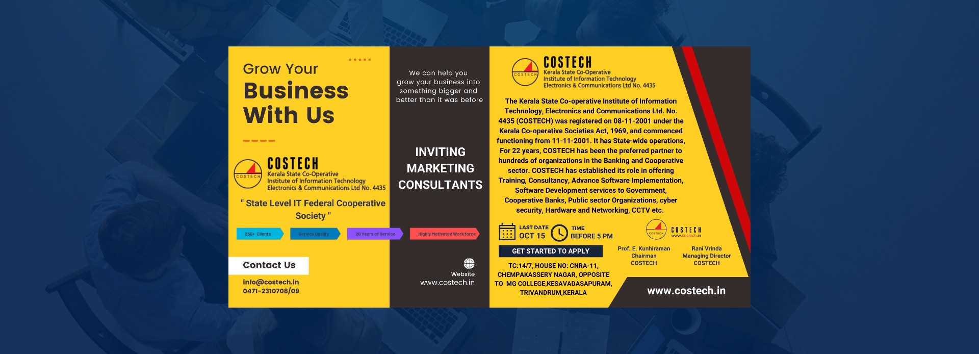 The Kerala State Co-operative Institute of Information Technology, Electronics and Communications Ltd. No. 4435 (COSTECH) was registered on 8-11-2001 under the Kerala Co-operative Societies Act, 1969, and commenced functioning from 11-11-2001. It has State-wide operations with its headquarters in Thiruvananthapuram and regional offices in Ernakulam, Thodupuzha and Thrissur.